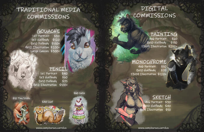 I am a self-taught hobby artist based in the US.I have been doing commissioned art work since 2008 and I cater mainly to the furry fandom. (I do have the ability to draw humans, but so far nobody has offered to pay for it.) I worked for a pet-sim game between 2009 and 2011 and began vending at furry conventions in 2012. My style is primarily realistic figures with rough brush strokes and organic shapes. I most like to draw trees and natural environments, and I take a lot of my own reference photos when I go hiking.My primary job is accounting for a small cytogenomics company and I do take individual and business tax clients. I also run a tax and accounting panel at some conventions and I am happy to field general questions.When I am not working or drawing, I play with my dog, ride my pony, decorate elaborate cakes, sew things, and play video games badly. Hit me up if you want an Animal Crossing buddy.